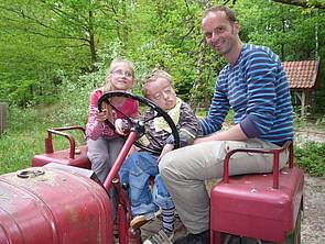 Eine weitere Überraschung für uns war auf dem Spielplatz: ein alter Trecker zum Spielen ...