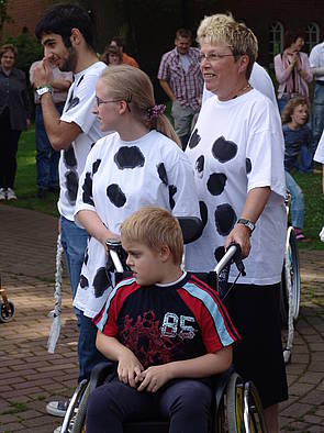 Wir haben zu der Musik "No milk today" von Herman´s Hermits einen Rollstuhltanz mit vielen Drehungen entwickelt. Als passendes Out-fit haben wir uns weiße T-Shirts mit schwarzem Kuhmuster bedruckt. Das Kuh-T-Shirt bekam noch einen Kuhschwanz aus Stoffstreifen.