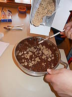 Die Cornflakes und die Mandelstifte zur flüssigen Schokolade geben und alles verrühren.