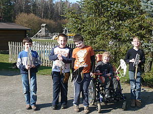 Dann wurden unsere Steckenpferde „getauft“ und bekamen einen Namen. Hier sind alle „Bärenkinder“ mit ihren Pferden zu sehen: Berk auf „Pony“, Kamil auf „Mimi“, Nikalas auf „Emil“, Dana auf „Klarissa“ und Marie auf „Kalle“.