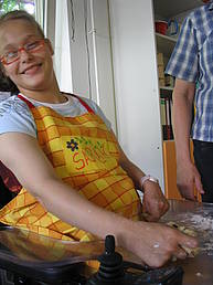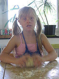 Am Montag und Dienstag haben wir Brötchen gebacken. Auf den Fotos seht ihr wie Annalena, Sarah Ro. und Sarah Ri. den Teig für die Rosinenbrötchen kneten.