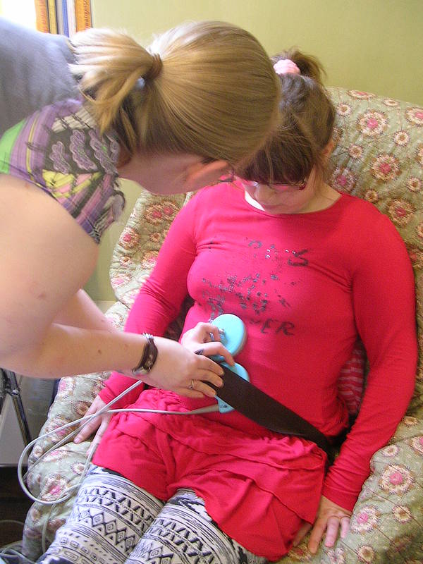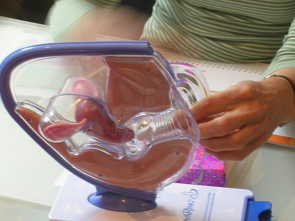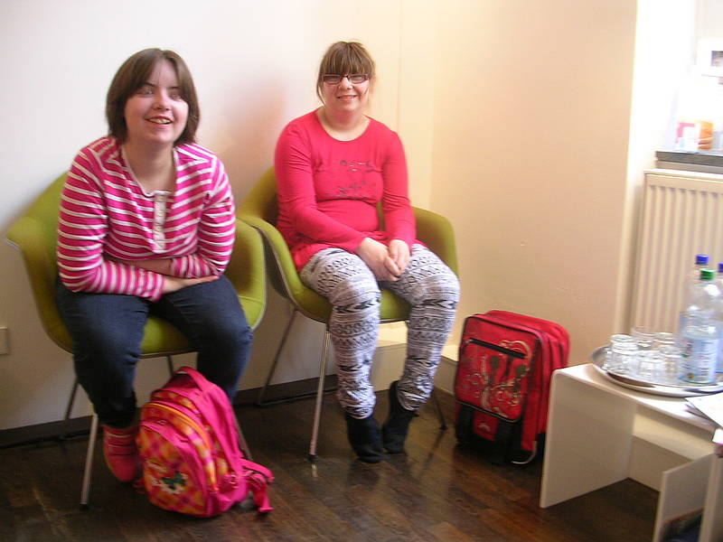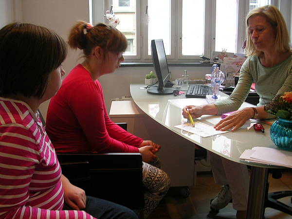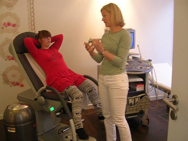 An jeder Tür steht, was dahinter gemacht wird, z.B. Sprechzimmer 1. Dort wird mit dem Arzt oder der Ärztin gesprochen. Nach dem Mammographie-Raum zeigt uns Frau Menke einen Raum, wo CTG an der Tür stand. Dort können schwangere Frauen die Herztöne ihrer ungeborenen Babys hören. Nicole hat gleich Platz genommen und Frau Menke zeigte ihr, wo die Kabel hingehören. In dem gemütlichen Raum hängen auch ganz viele Fotos von den Babys und ihren Eltern, die von der Praxis betreut wurden. Dann haben wir bei Frau Dr. Amend im Büro gesessen und uns über Menstruation, Binden, Tampons, Regelschmerzen, Bauchschmerzen, Geschlechtsverkehr und Verhütung unterhalten. Dr. Amend zeigte uns nochmal, wie ein Tampon benutzt wird und dann sind wir in den Untersuchungsraum gegangen. Dort stand ein Untersuchungsstuhl, auf den sich nur Nicole getraut hat. Dr. Amend erklärte uns dann, wie eine Untersuchung bei einem Mädchen oder Frau gemacht wird. Zum Schluß hat Nicole dann noch ein Ultraschallbild von ihrer Blase (da waren ca. 40ml Flüssigkeit drinnen!) und ihrem Herz bekommen. Das war alles ganz klasse - aber auch richtig viel Wissen!