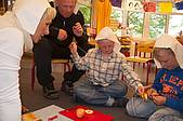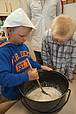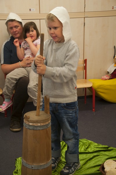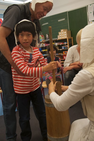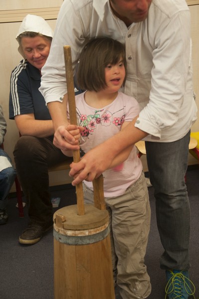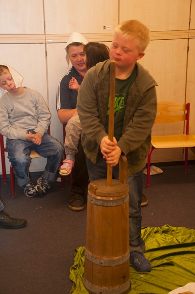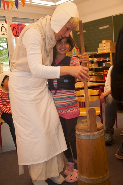 Am Donnerstag sollte bereits der letzte Arbeitstag der Bauern sein. Nachdem wir unsere „Arbeitskleidung“, die Bauernmütze, aufgesetzt hatten, begutachteten und probierten wir zunächst das Fladenbrot von gestern. Bäuerin Martha war sehr zufrieden mit unserer Arbeit! Sie meinte, dass es zum Brot auch Butter geben sollte und führte uns ein Butterfass vor, mit dem die Bauern früher Buttergemacht haben. Wir übten mit dem Butterfass zu stampfen und lernten den Spruch „Komm, Butter, komm!“.
