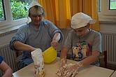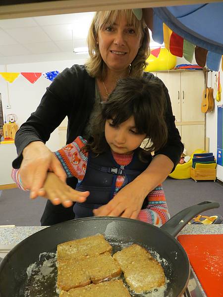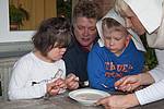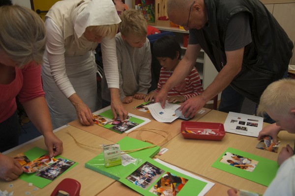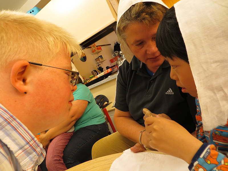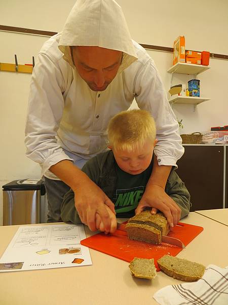 Am Mittwoch wurden wir Bauern zu „Bäckern“. In einem Film sahen wir, wie mühsam es früher war, Brot zu backen: das Mehl mit der Hand auf einem Stein mahlen, Feuer machen mit einem „Funkeneisen“, den Ofen anheizen, den Teig per Hand kneten ... Das Interessante war, der Bauer aus dem Film hatte die gleiche „Kappe“ wie wir!