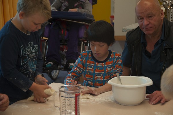 Dann machten wir uns wieder an die Arbeit. Die Bauern im Mittelalter hatten kein Rezept und wählten die Zutaten „freihand“. Wir lasen zuerst das Rezept: drei Tassen Mehl, eine Tasse Wasser, ein Esslöffel Sauerteig und eine Prise Salz. Für Berk lautete das Rezept: 300 gr Mehl, 125 ml Waser usw.
