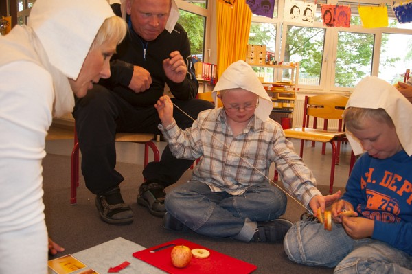 An unserem ersten „Arbeitstag“ begrüßte uns zunächst Bäuerin Martha zusammen mit Bauer Andreas. Sie zeigten uns, wie die Menschen im Mittelalter Obst konservierten. Wir trockneten Apfelringe. Zuerst entkernten wir die Äpfel, dann schnitten wir dünne Scheiben (was nicht so einfach war) und zum Schluss fädelten wir die Apfelringe auf und hängten sie am Fenster auf.