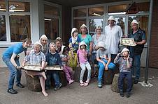 Zu den „Bauern und Bäuerinnen im Mittelalter“ gehörten Aaliyah aus der Bärenklasse, Alicia, Till und Kotaro aus der Igelklasse, Louis aus der Mäuseklasse, Berk aus der Klasse Bou-Vinals sowie Beatrice aus der Klasse Rother. Unser „Kennzeichen“ war eine Mütze, wie sie von den Bauern im Mittelalter getragen und jeden Morgen zu Beginn unserer Arbeit verteilt wurde. In der Projektwoche beschäftigten wir uns vor allem mit dem Essen und Trinken der Bauern damals.