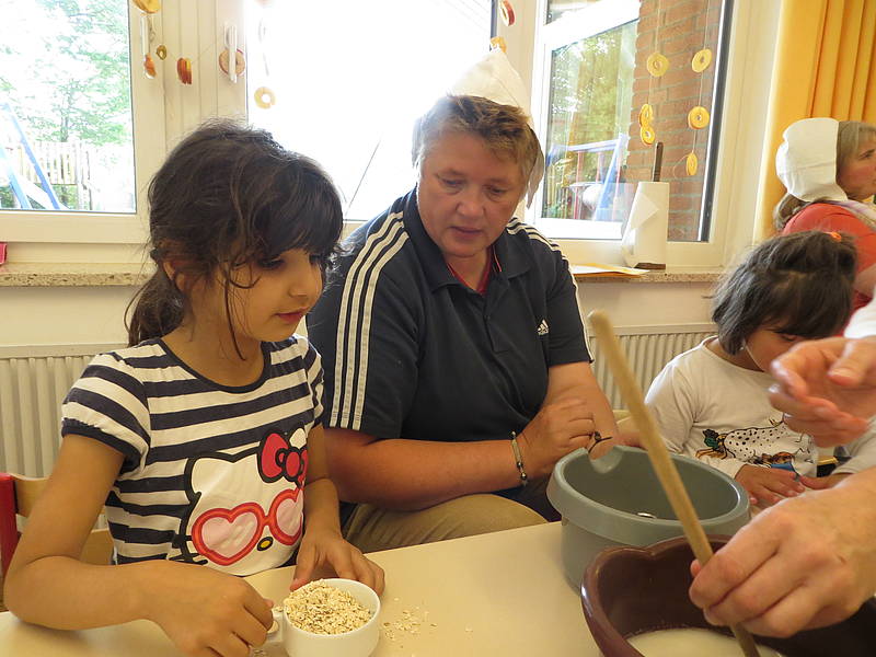 Nach der Pause ging es spannend weiter: Grütze kochen über offenem Feuer auf dem Schulhof! Im Klassenraum schauten wir uns das Rezept an und maßen die Zutaten ab: eine Tasse Haferflocken und zwei Tassen Wasser.