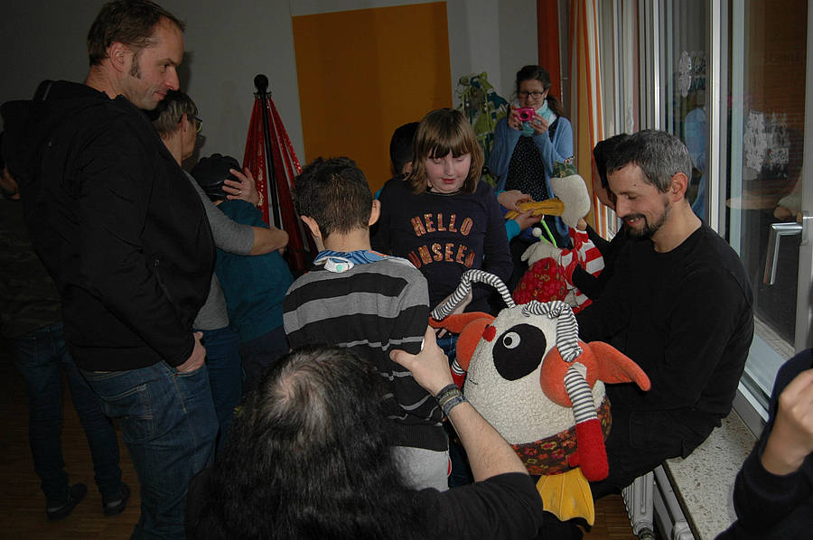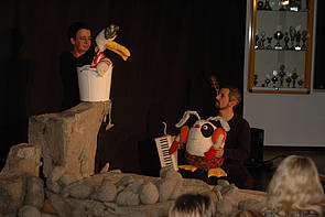 Suse Wessel und Kian Pourian hatten ihre Spielfiguren dabei und schon ging´s los: Der Wind heult, das Meer tost und die Nacht ist schwarz, als der Sturm das kleine Meerwesen hinaus auf den Strand schleudert. Es ist zu klein, um schon gut schwimmen zu können, und das Fliegen hat es noch nicht gelernt. Am Strand begegnet es einer eigenwilligen Winterkrabbe, einem eiligen Aal und einem weltgewandten Albatros. „Hast du nie Angst?“ fragte das Meerdings. „Keine Angst, mitten über dem Ozean verloren zu gehen? Keine Angst vor den Stürmen und der Dunkelheit und dem Wind, der überall um dich herum heult?“ „Einen Albatros, der sich fürchtet, gibt es nicht“, sagte der Albatros.