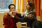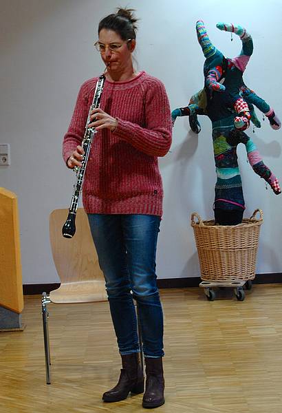 Dabei erzählten sie uns viel über Klangfarbe und Tonumfang, aber auch über die Mundstücke für die Oboe, die Frau Ingwersen immer zu Hause selber bauen muss. Zum Ausprobieren hatten die beiden Musikerinnen eine Kunststoffquerflöte dabei. Leider blieb viel zu wenig Zeit, als dass alle Kinder die Flöte hätten ausprobieren können!