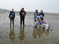 In Cuxhaven gibt es einen schmalen Sandstrand zur Nordsee. Dahinter liegt ein großes flaches Wattenmeer, dass sich bis zu der Insel Neuwerk erstreckt. Das Wattenmeer ist ein Meeresboden, der bei Niedrigwasser trocken fällt und regelmäßig überflutet wird. Hier leben viele Tiere, sie sich diesen Lebensbedingungen angepasst haben. Am Dienstag sind wir gemeinsam mit einer Wattführerin im Wattenmeer gewandert. Wie gut, dass wir alle Gummistiefel dabei hatten! Für Siana konnten wir einen Wattrollstuhl ausleihen. Das ist ein riesiges Gefährt, das große Gummireifen hat und dadurch nicht einsinkt. Siana war auch begeistert und hat es genossen, gefahren zu werden. Auf dem zweiten Foto sehr ihr Simon, der es gerade geschafft hat, einen Wattwurm mit einer Mistgabel auszugraben.
