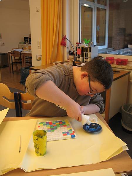 Als Vorübung bemalten wir weiße Blätter mit Tusche in verschiedenen Farben. Nachdem diese getrocknet waren, schnitten wir 5x5 cm große Farbkärtchen zurecht. Anschließend klebten wir die Kärtchen zu einem bunten Mosaik auf einen DIN A2 Tonkartonbogen. Das Ergebnis gefiel uns sehr gut und motivierte uns weiter zu machen.