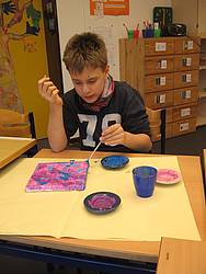 Die Ergebnisse haben wir nach Fertigstellung mit Fotos der Künstler auf dem Schulflur aufgehängt, so dass sich alle an den farbenprächtigen Unikaten erfreuen können.