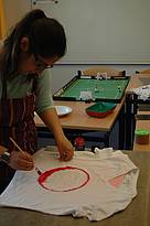 Im Anschluss bastelten wir Fanartikel. Die Schülerinnen und Schüler gestalteten T-Shirts mit der gewünschten Landesflagge. Die meisten wählten die deutschen Farben, doch es wurden auch zwei T- Shirts mit dem türkischen Emblem angefertigt. Die große Schwierigkeit bestand darin mit der Stoffmalfarbe die vorgezeichneten Felder auszumalen. Parallel dazu wurden Armbänder mit den gewünschten Landesfarben hergestellt. Den künstlerischen Arbeiten gingen wir auch am zweiten Tag nach, sodass die T-Shirts trocknen konnten um anschließend gebügelt zu werden.