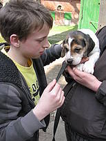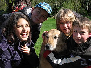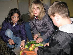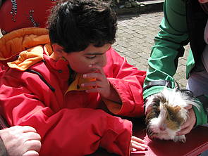 Nachmittags gehen wir zu Frau Winterfeld. Bei ihr dürfen wir Meerschweinchen und Kaninchen füttern und streicheln. Wir essen Kuchen und können uns die Wellensittiche, Laufenten und Hühner ansehen und mit den beiden Hunden spielen. Jakob mag die alte Hündin Merle besonders gern, wenn sie gähnt ruft er immer: „Da lacht der Hund!“ Feride überwindet ihre Angst vor Hunden. Zum Schluss wird noch gearbeitet: Frau Winterfeld zeigt uns wie man Apfelchips macht. Feride darf den Dörrapparat anstellen und morgen können wir die fertigen Chips abholen.