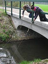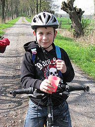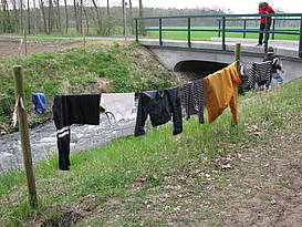 Nach dem Frühstück fahren wir mit unseren Rädern zum Mühlen-graben. Wir haben Käscher dabei und fangen gleich zwei Stichlinge, eine Schnecke und einen Wasserläufer. Jakob findet das total spannend und ist dabei ins Wasser gesprungen. Er war so flink, dass ihn niemand mehr festhalten konnte. Zum Glück ist es zum Jugend-heim nicht weit und Christian holt ihm schnell trockene Sachen. Frau Pries und Frau Twer helfen Jakob aus seinen nassen Sachen heraus und geben ihm etwas zum Überziehen. Das nasse Zeug hängt über einem Zaun, das sieht lustig aus. Aus Stöcken, Bindfäden und Büroklammern bauen wir uns Angeln, mit Rindenstücken als Pose (Simons Idee). Leider hat aber kein Fisch angebissen. Nachmittags fahren Siana, Jakob, Christian, Gaby und Jana mit der